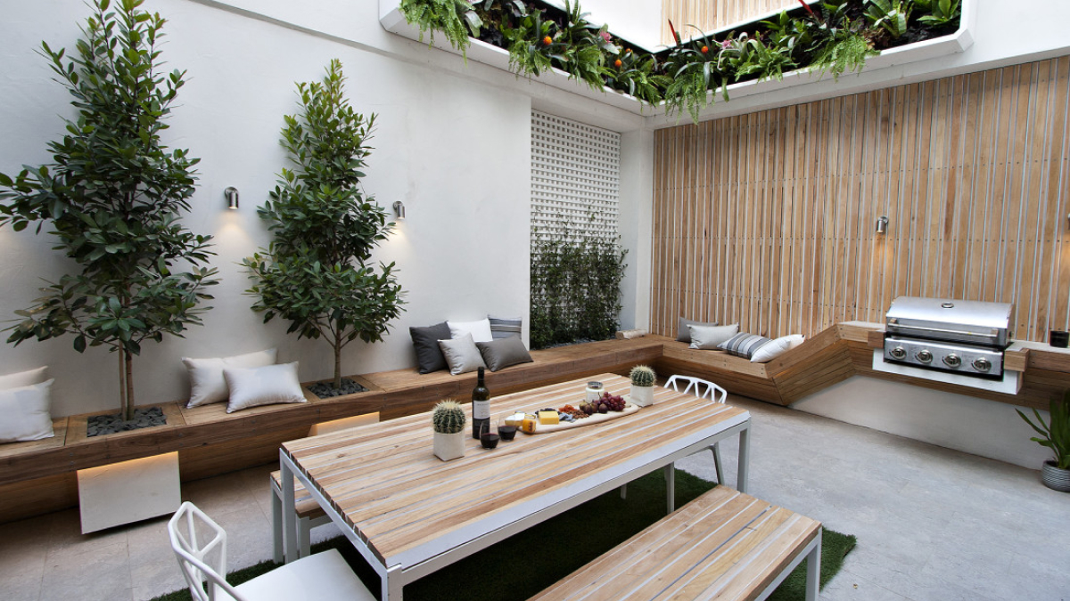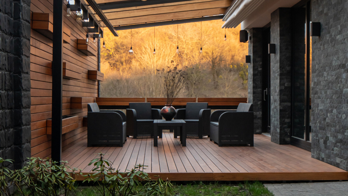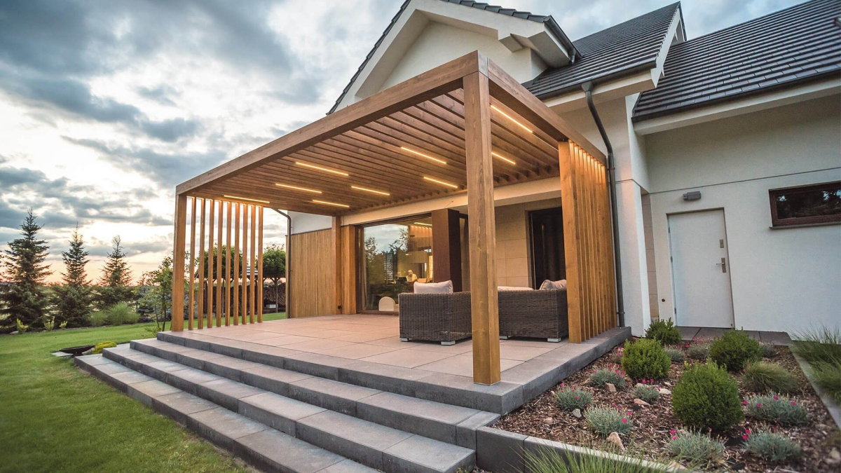 Teras dengan menggunakan kayu memberikan sentuhan hangat dan alami pada eksterior rumah. Kayu memiliki kelembutan yang menyenangkan saat diinjak, serta memberikan kesan estetika yang timeless. Anda dapat memilih kayu solid atau menggunakan decking kayu untuk menciptakan teras yang tahan lama dan mudah perawatannya.